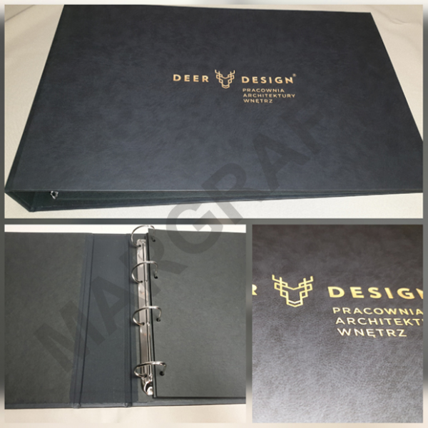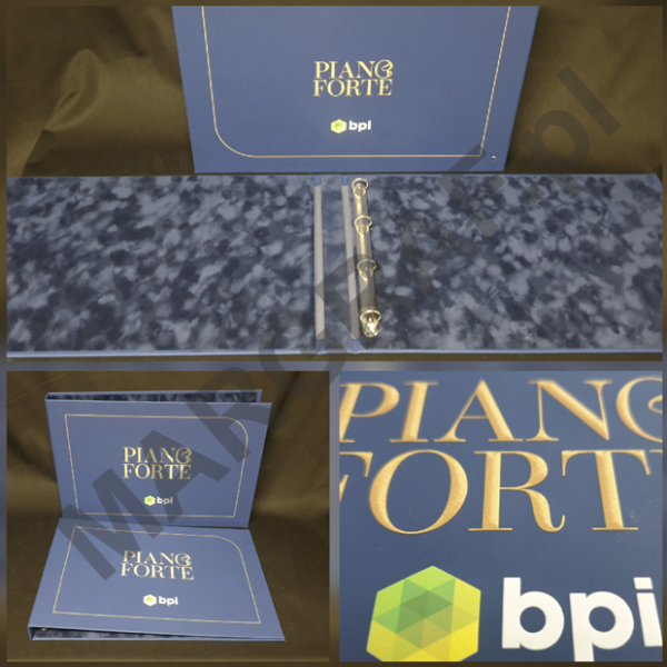 Może posiadać indywidualne napisy grawerowane laserem lub nadrukowane, imitujące np. złotą farbę; okucia w narożnikach; może być kaszerowany gąbką (np. frontowa strona okładki miękka jak w kalendarzach książkowych), może posiadać 2 lub 4 ringi.